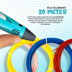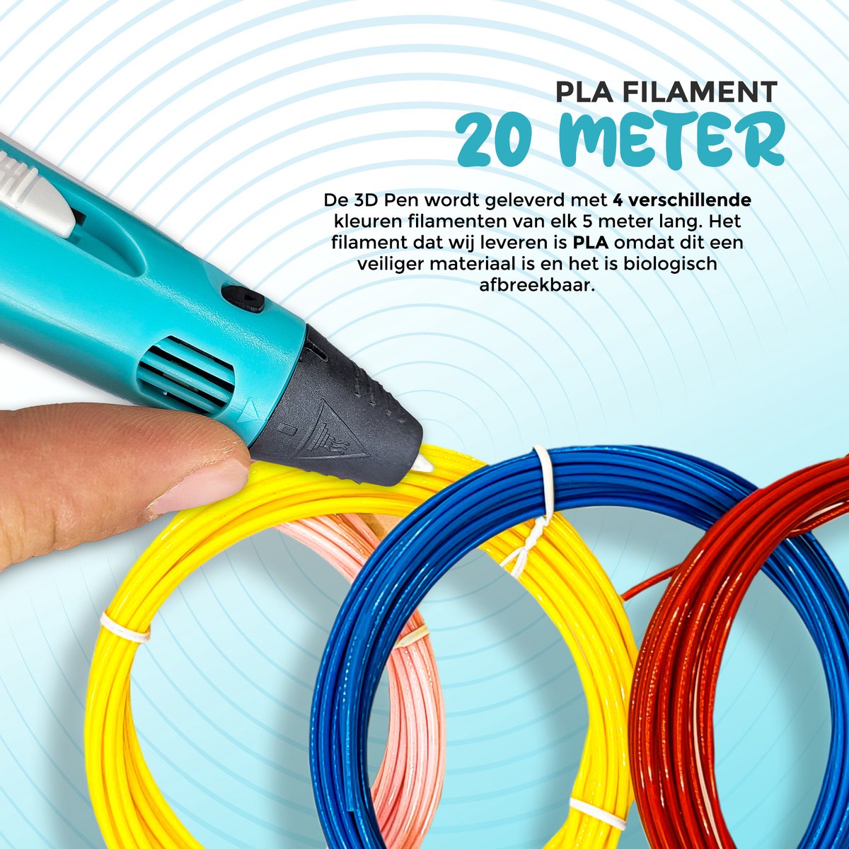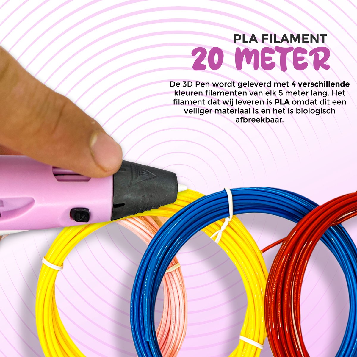 De pen werkt uitsluitend met PLA-filament. Dit is een milieuvriendelijk, biologisch afbreekbaar materiaal dat veilig en gebruiksvriendelijk is voor creatieve projecten.