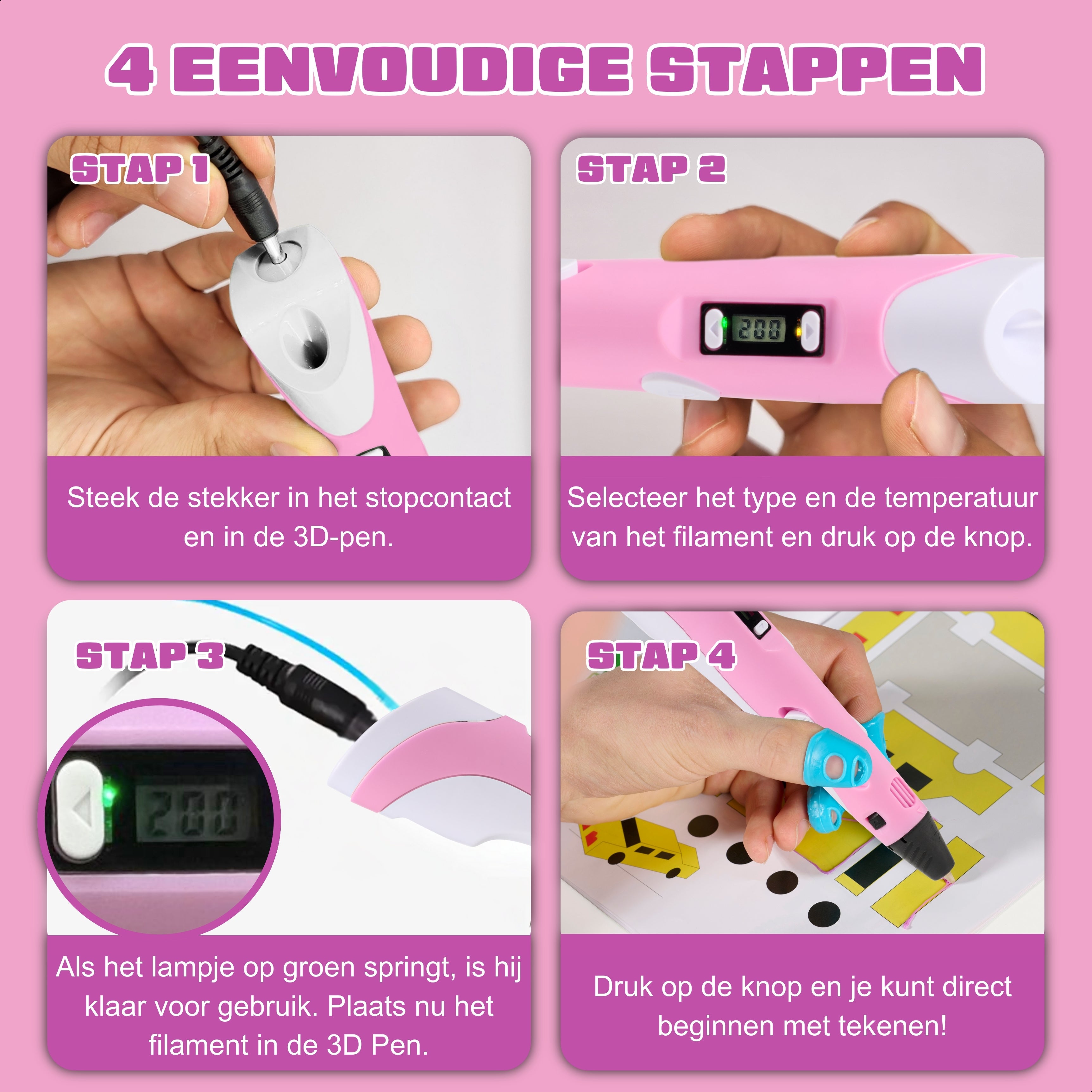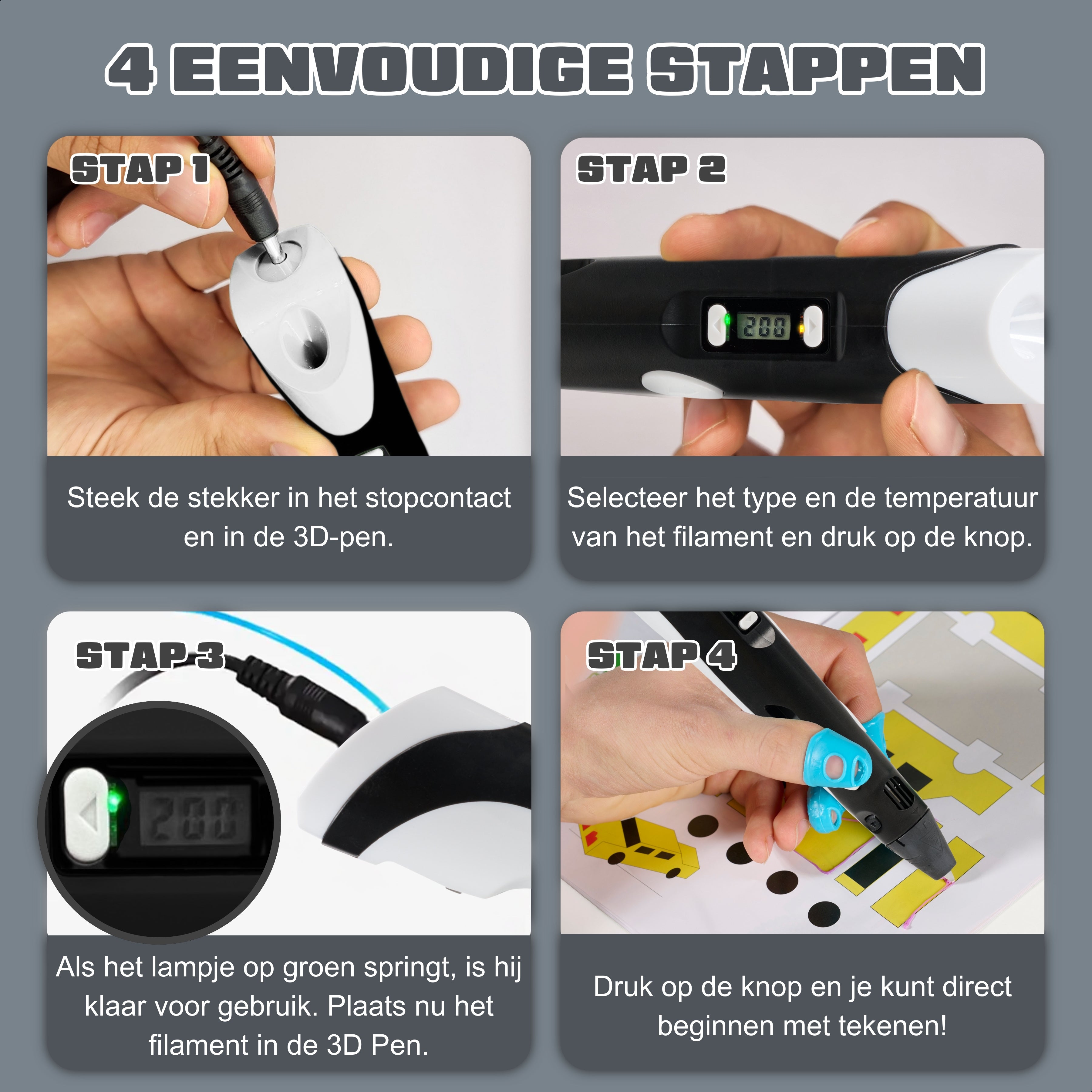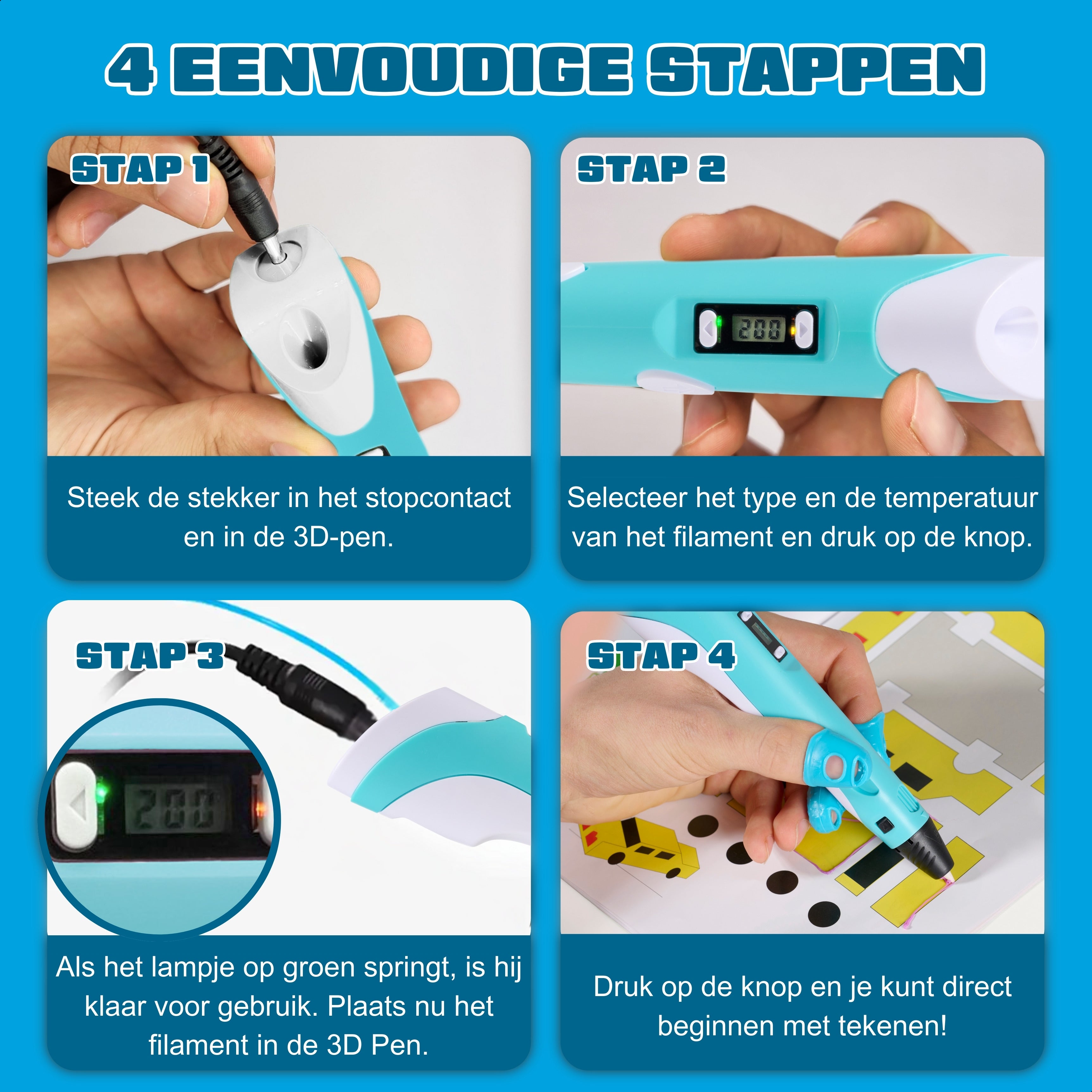 De pen werkt uitsluitend met PLA-filament. Dit is een milieuvriendelijk, biologisch afbreekbaar materiaal dat veilig en gebruiksvriendelijk is voor creatieve projecten.