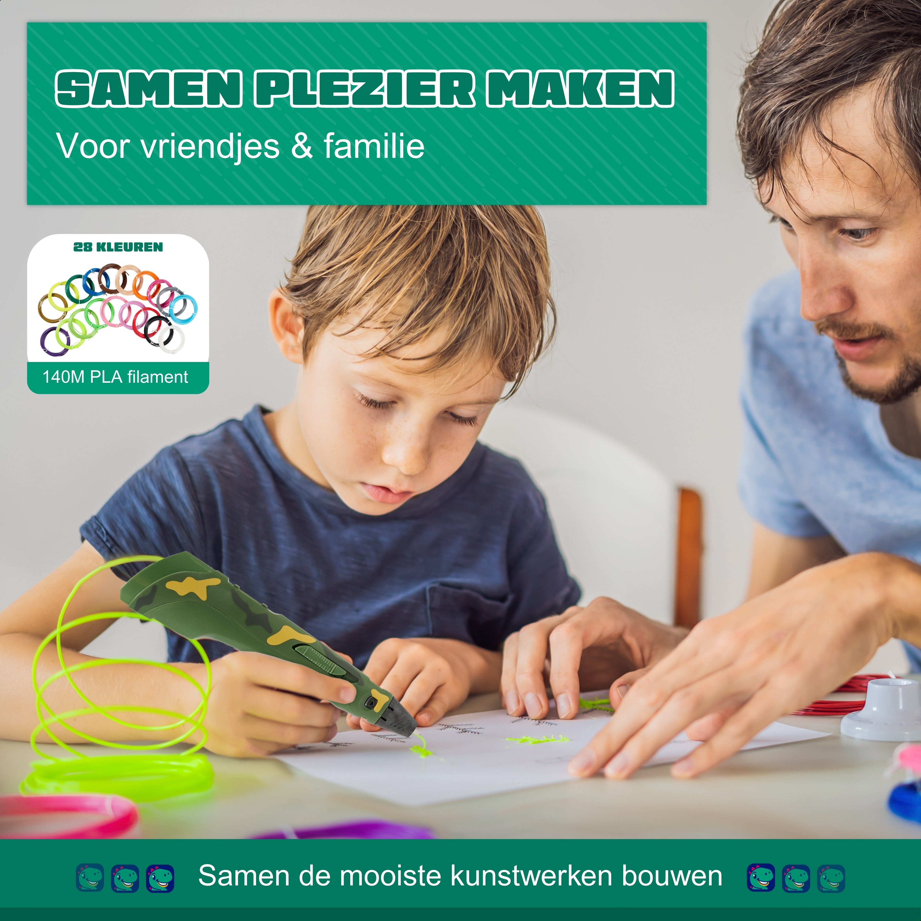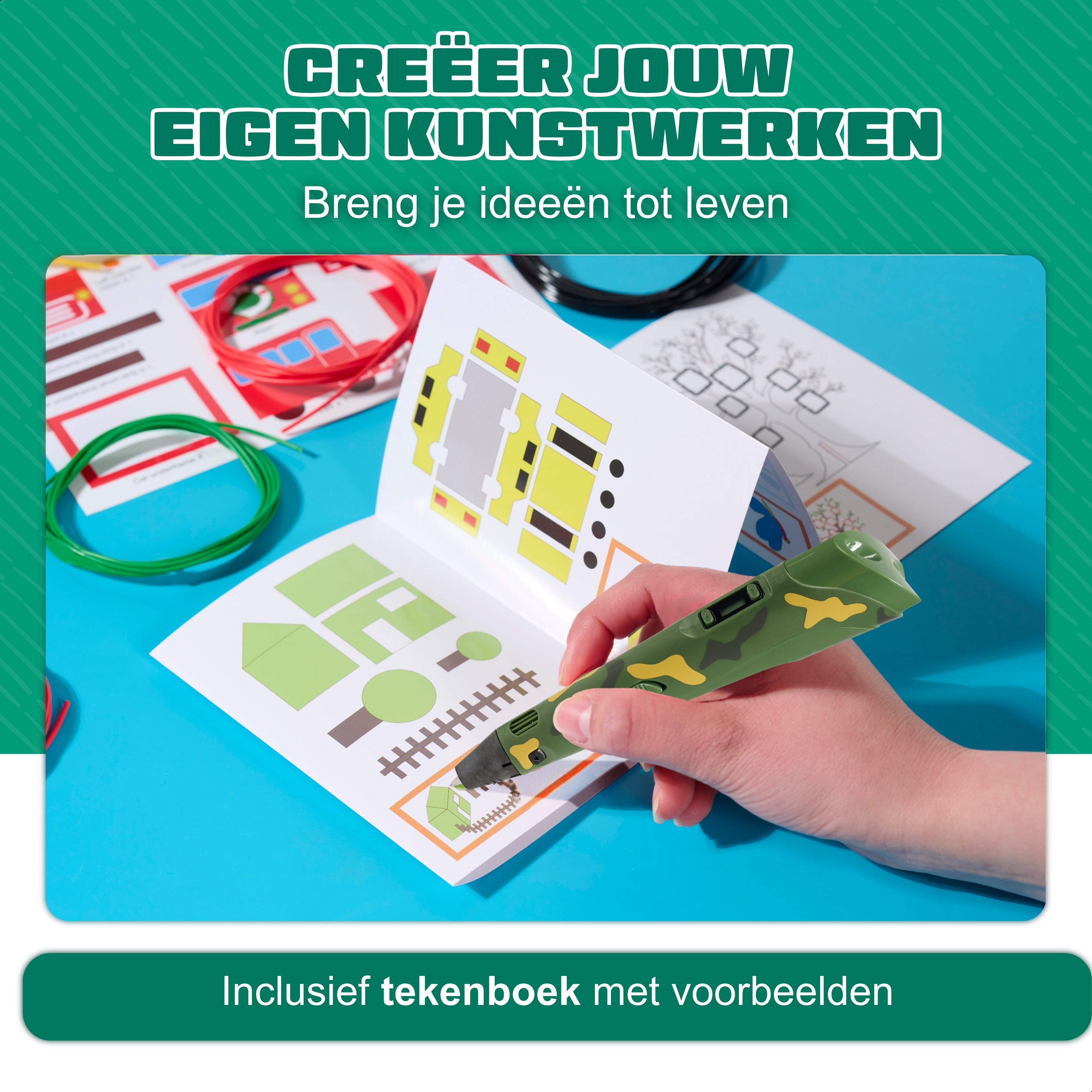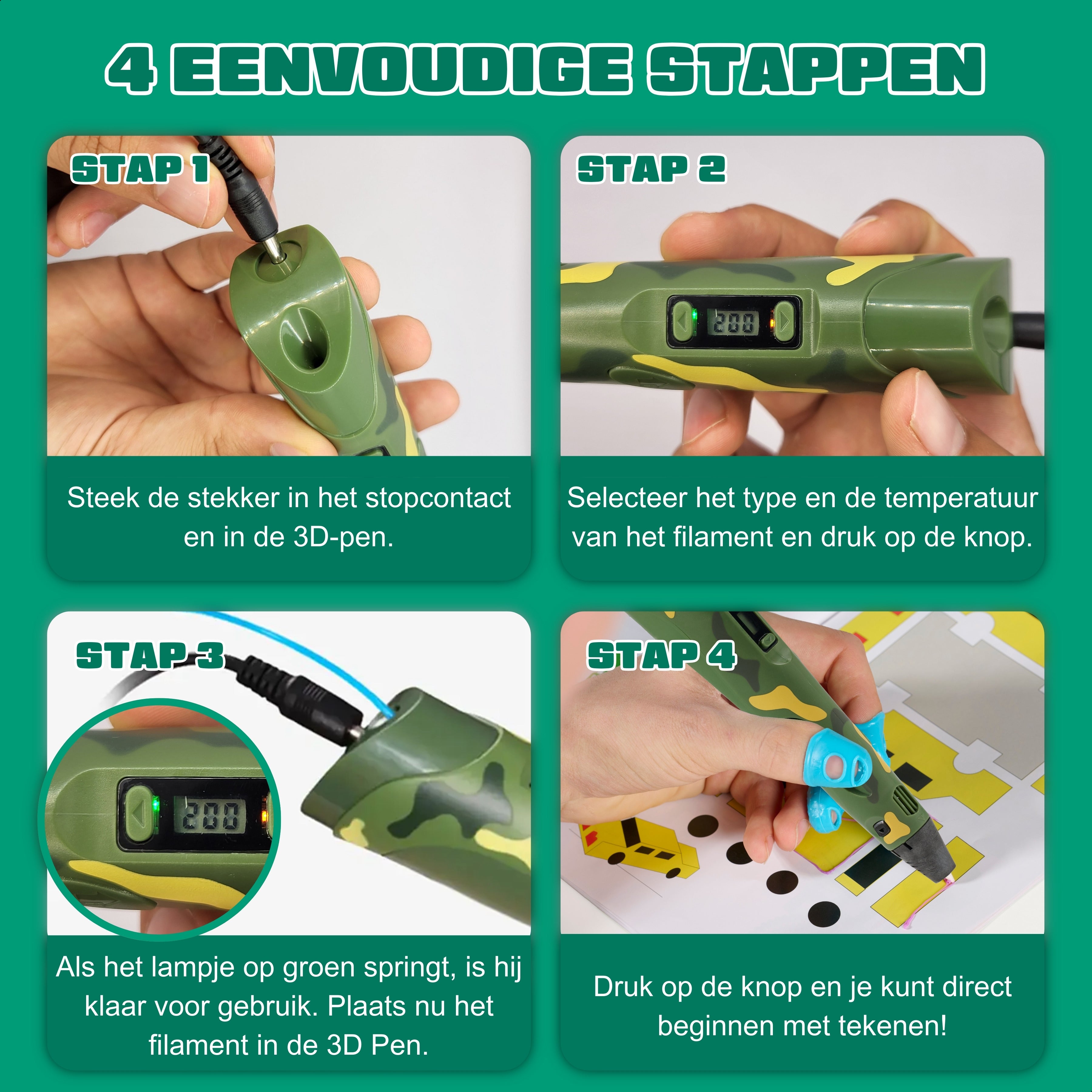 De pen werkt uitsluitend met PLA-filament. Dit is een milieuvriendelijk, biologisch afbreekbaar materiaal dat veilig en gebruiksvriendelijk is voor creatieve projecten.