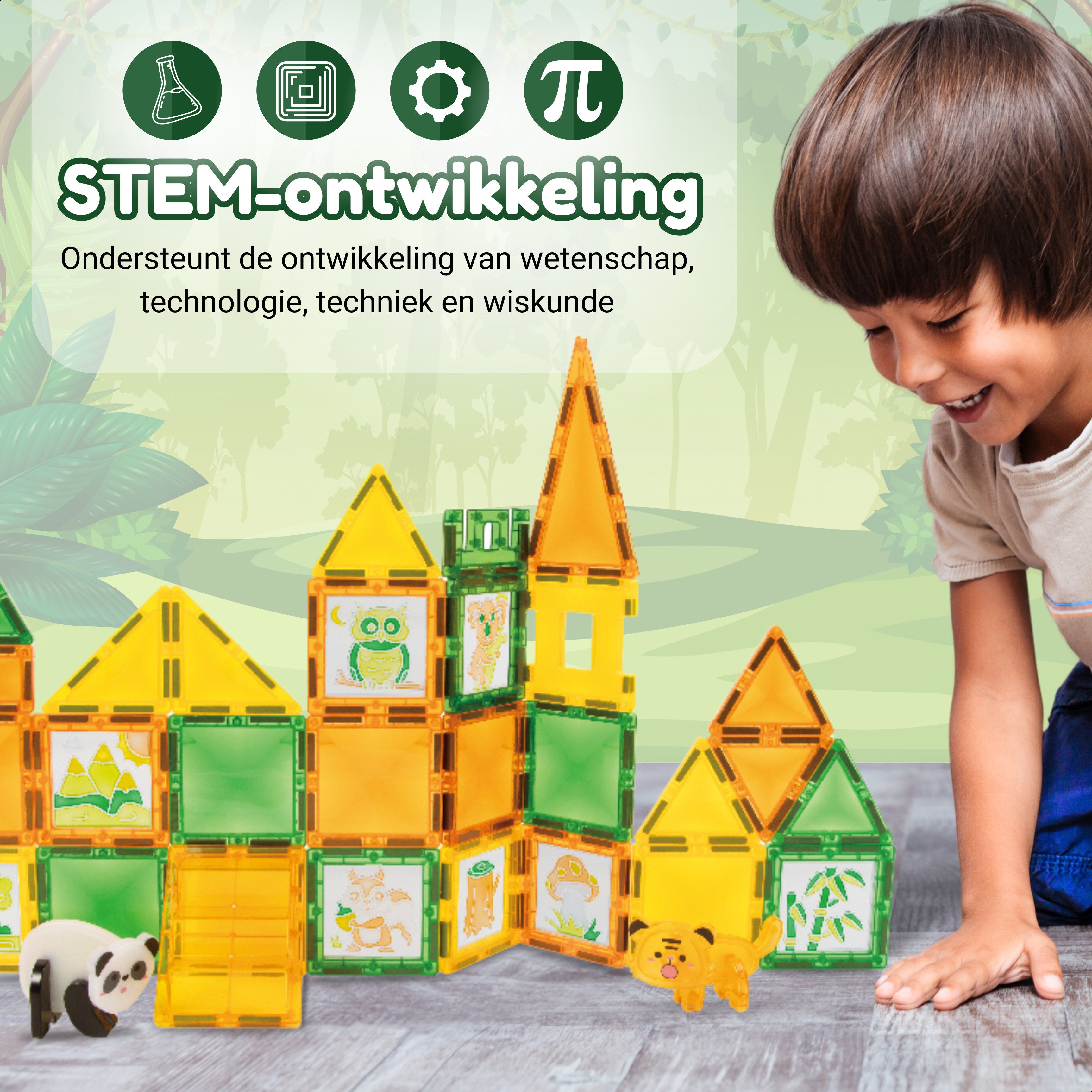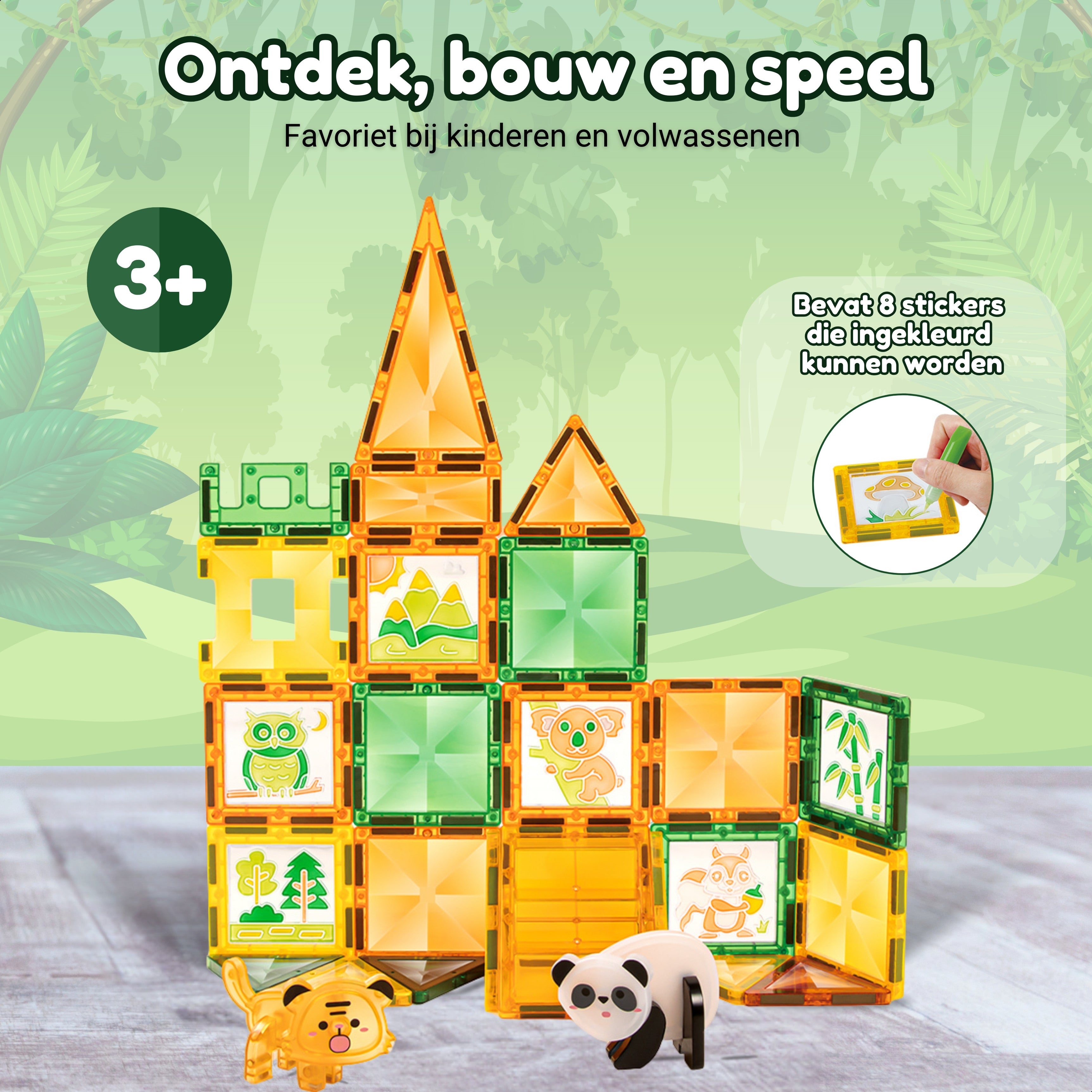 Ga op avontuur in het regenwoud met Fits4Kids® Jungle Journey. Een 47-delige set magnetic tiles in levendige groen-, geel- en bruintinten. Dit magnetisch speelgoed neemt kinderen mee op ontdekkingstocht tussen wilde dieren, lianen en tropische bomen. Uniek aan deze set: er zitten ook kleurloze tegels bij die kinderen zelf kunnen inkleuren met de meegeleverde verfstiften. Zo maken ze hun junglewereld helemaal persoonlijk. Onze tegels zijn te combineren met die van andere bekende merken en bieden exact dezelfde kwaliteit, waardoor je eenvoudig kunt uitbreiden.